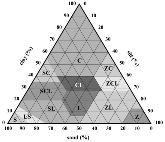 Textural Classification Chart (by USDA [68], redrawned). C: clay; SC: sandy clay; ZC; silty clay; SCL: sandy clay loam; CL: clay loam; ZCL: silty clay loam; S: sand; LS: loamy sand; SL: sandy loam; L: loam; ZL: silt loam, Z: silt.