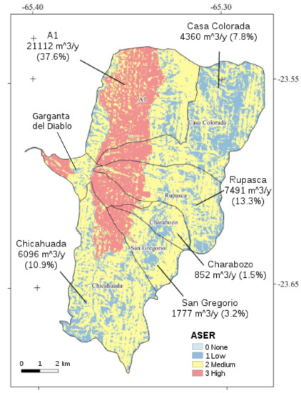 To solve the problem, Marcato et al. [60] proposed the deviation of the Rio Huasamayo before the village, building an artificial channel working as drainage channel. The preservation of Tilcara, however, would not reduce the hydraulic risk, which would only be transferred downstream the Quebrada towards the village of Maimará. Then, we propose an alternative solution, intervening at the origin of the problem. By way of direct observations and the study of existing maps and satellite images, by applying the method proposed by Gavrilovic and using the CORINE Project data, it is possible to estimate the volume of material produced by the Rio Huasamayo watershed, identifying the main supplying areas where focused interventions for the control of solid transport could be realized [9].