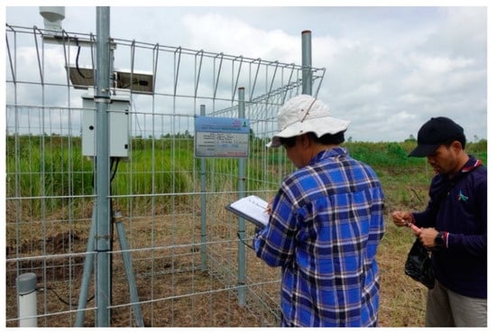 Data from 13 stations of real-time WT depth monitoring system, namely SIPALAGA provided by Peatland Restoration Agency (BRG) and the Agency for The Assessment and Application of Technology (BPPT) Indonesia were used. These stations are located in the Pulang Pisau and Kapuas Regency area, in South Kalimantan. The sensor was able to send data on the water table, soil moisture, and rainfall every hour for 24 h non-stop. The picture of real-time WT depth station in the field is shown in Figure 1.
