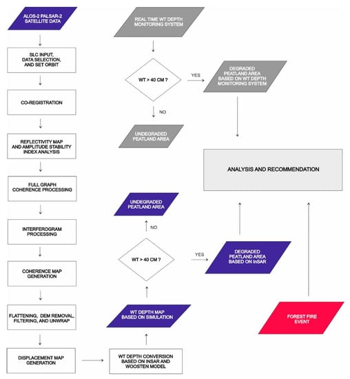 The research method started from the SAR interferometry analysis and then continued with the implementation of the Wosten model [18] to obtain the WT depth distribution map. Based on the WT depth condition, depths of more than 40 cm are classified as degraded peatland areas, based on scientific reports [18,19,20,21,22,23,24] and Indonesian regulations [20,21]. Subsequently, a degraded/undegraded peatland map is created based on InSAR and WT depth monitoring system. These results were then compared using previous peatland fire data with overlay techniques.