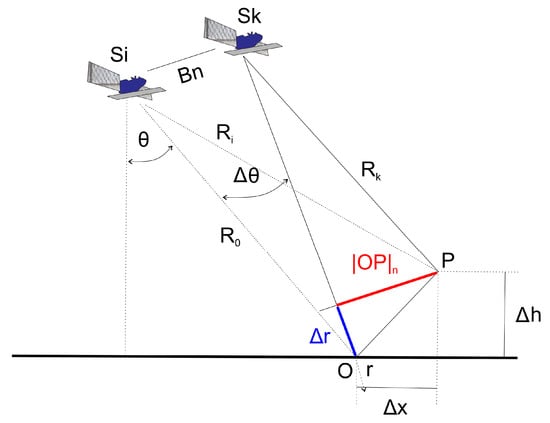 Acquisition geometry for interferogram generation shows in Figure 3 [29] where S is the satellite at position i and k. O is the reference point and P is the target under examination. P is located at distance Δx w.r.t O and at height Δh. The master of slant range is indicated as r.