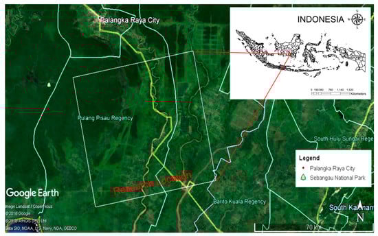The research location is in peatland areas on the southern part of Palangkaraya City, in Pulang Pisau and Kapuas Regency, Central Kalimantan, Indonesia (Figure 4).
