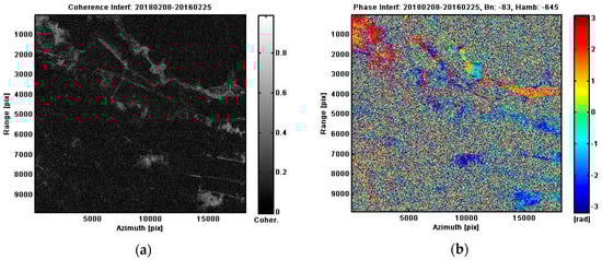 The next step is called interferogram flattening. The flat terrain phase term was removed because there was no useful information due to availability of orbital data to simulate it. Then, the ambiguity height Δha, the height that generated a phase rotation was equal to 2π, was calculated using Equation (6):
