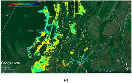 Based on SAR interferometry analysis, using ALOS-2 PALSAR-2 data acquired in February 2016 and February 2018 as an input, a coherence interferogram map was obtained. The coherence interferogram map is the result of cross-correlation between two pairs of images. Regarding the results of the analysis process as shown in Figure 6a, the interferogram could not be generated on the entire image due to large temporal correlation. Temporal decorrelation is usually caused by the dynamics of vegetation cover on peatlands.