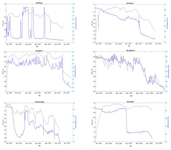 As shown in Figure 7, from Pilang Station 1, it is found that the water table condition was less than 40 cm, starting in June, as well as data from Pilang 2 station. Based on data from Jabiren 1 station, the WT depth condition was also very dynamic and declined in July. At Jabiren 2 station, the WT depth decrease to below 40 cm occurred in early February and continued to deteriorate until July. At Saka Kajang Station, the decrease of WT depth to below 40 cm began in April, although the dynamics were quite high, and the fall was approaching in July.