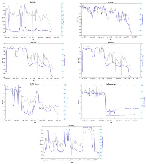 At Henda 1 station, even the condition of the WT depth had been deficient starting in January of minus 1.7 m and continued below 40 cm until July. At Henda Station 2, the decrease below 40 cm were also detected in the beginning of January, although not as significant as at Henda Station 1, but the terms also continued to decline until July. At Garung station, the decline of WT depth started in July. At Kalawa Station, the WT depth decrease began from January and slightly increased until April, but then continued to decline until July. A similar pattern also occurred in Buntoi station.