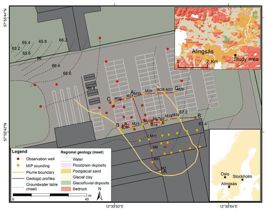 Overview of the Alingsås site where the observation wells (red circles), the Membrane Interface Probe (MIP) soundings (orange circles), the groundwater level (black dashed lines), the plume boundaries (orange line) and the regional surface geology (top right, created with data from SGU Jordarter, 1:25,000–1:100,000 © SGU) can be seen. Line A-A’, B-B’ and C-C’ marks the location of geological profiles shown in Figure 2.
