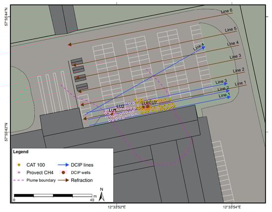 The measurements were focused on the contaminant source and plume area outside of the buildings where the pilot injection was planned to take place. Four DCIP surface lines (Figure 3) with electrodes buried 40 cm into the ground were established to provide a permanent installation with a total of 64 stainless steel metal plate electrodes (10 × 10 cm) for each line in the DCIP monitoring system. The spacing between the electrodes is 1 m; however, the first four electrodes (except Line 4) and the last nine electrodes (all lines) are separated by 2 m to increase the depth of investigation. A multiple gradient array measurement sequence was used for the measurements [].