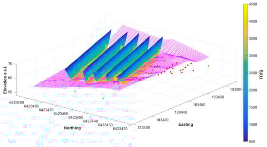 The results for all seismic refractions were plotted in a three-dimensional (3D) ‘fence’ diagram (Figure 5). We used the of 3500 m/s velocity to fit a surface within the different tomography lines to acquire pseudo-3D representation of the bedrock surface, using linear interpolation.