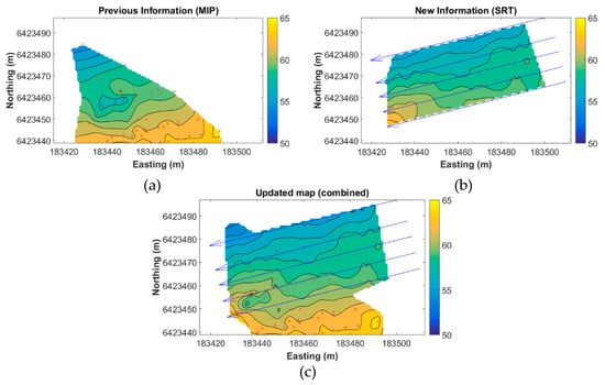 Interpolated surface map of depth to bedrock from the (a) MIP soundings [,] (b) Seismic Refraction tomography (SRT) (c) combined. The bedrock surface is plotted with absolute elevation (meters above sea level). Coordinates are in SWEREF99 TM12.