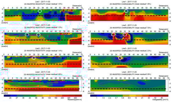 The model that was proposed by Johansson [] describes a rise in the chargeability due to the degradation products of PCE (TCE, DCE, VC and Cl-). We can identify an increase in the chargeability in the surface layouts that are not affected by the infrastructure (Line 3 and Line 4). Unfortunately, the infrastructure increases the complexity in the chargeability signal close to the building because the buried objects (mainly metal pipes) have high responses, which masks the expected lower responses coming from the degradation products of the contaminant.