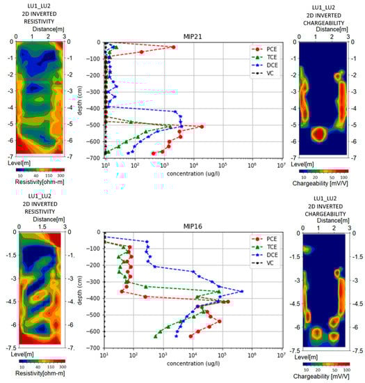 Cross-hole tomography results for resistivity (left) and time-domain chargeability (right) in comparison with the respective concentrations from the MIP sounding (middle []) for LU1-LU2 (top) and LU6-LU7 (bottom). The locations of the boreholes can be seen in Figure 3.