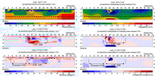 The composition of the two consortiums differs significantly; the CAT100™ (east) contains iron particles to enhance the degradation process, while the Provectus™ (west) is essentially a cocktail of microbes that will actively feed from the contaminant reducing its concentration. Therefore, it is expected that the geophysical response from the two consortiums will be different as we can observe looking at the time-lapse results from Line 3 (Figure 9) and Line 4 (Figure 10).