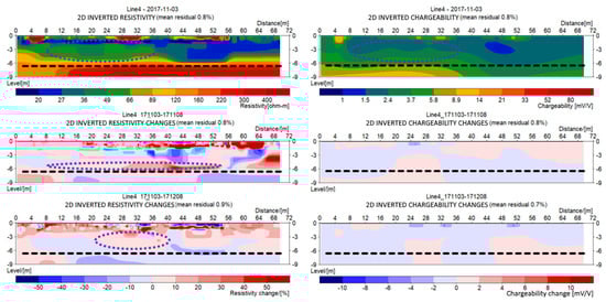 The temporal changes seen from Line 4, which is located outside the injection area (Figure 3) show an increase in resistivity at the depth of 6–7 m (Figure 10 middle-left), which coincides with the coarse (sand and gravel) layer that appears to be present in the area at that depth. The hydraulic conductivity of the coarse layer should be higher than the upper (clay) and lower (bedrock) geological units; therefore, one possible interpretation is that the injection fluids, most likely the CAT100™, show up due to flushing through the coarse-grained unit and into this down gradient area. The temporal changes in the chargeability are very low, meaning that there is no direct effect in the chargeability signature of the subsurface due to the injection, at least not in the time-step following the injections. The very small changes also strengthen the previous observation that the changes in the chargeability in Line 3 could be due to artifacts of the time-lapse inversion caused by the strong responses from the buried infrastructure.