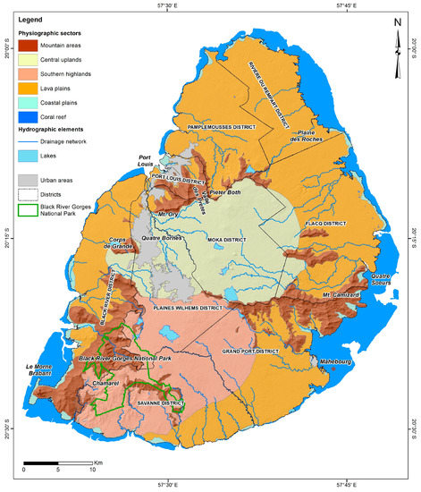 Mauritius, together with Réunion (capital Port Mathurin; 19°41′ S, 63°25′ E), Rodrigues (capital St. Denis; 20°52′ S, 55°27′ E) and some further smaller islands, is part of the Mascarene Archipelago, situated along the southern part of the Mascarene submarine ridge in the Indian Ocean (Figure 1a). The island has an overall surface area of about 1860 km2 with a maximum elevation of 828 m a.s.l. in the Black River Gorges National Park, near Chamarel (Figure 1b). It comprises the remnants of a massive shield volcano that has a covering of younger volcanic rocks. Some of the volcanic craters still contain lakes and, locally, the rivers give rise to impressive waterfalls. From a physiographic standpoint, it consists of a broken ring of mountain ranges, encircling a central plateau extended at an altitude of about 600 m a.s.l. and surrounded by gentle slopes down to the coastal plains. The whole island is rimmed by a coral shelf and the related lagoon.