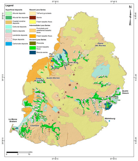 Geo-lithological scheme of Mauritius Island (modified from Giorgi et al. [40]).