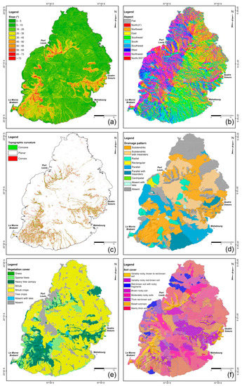 The vegetation cover plays an important role in slope stability. In general, sparsely, or poorly vegetated areas are affected by faster soil erosion and greater instability than forested ones [26,58,72]. In the study area, a vegetation map (Figure 4e) was derived from the photogeological analysis and the land-use map [53]. Vegetation cover was classified into eight classes, in which areas with absent vegetation correspond to urban areas. The predominant vegetation type is shrub crops, including sugar canes, which cover most of the lava plains, and the central and southern highlands, whereas forests (heavy tree canopy and sparse trees) cover large parts of the mountain areas.