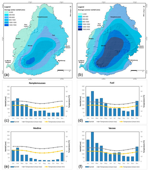 (a) Average winter rainfall map; (b) average summer rainfall map; (c) termo-pluviometric diagram of the western region (Medine); (d) termo-pluviometric diagram of the central region (Vacoas); (e) termo-pluviometric diagram the eastern region (Fuel); (f) termo-pluviometric diagram of the northern region (Pamplemousses).