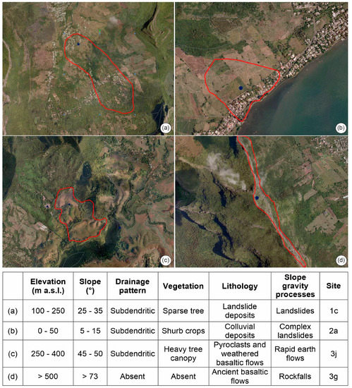 Chamarel area (Figure 7c) is in the Black River District, located at intermediate elevation (ranging from 250 to 400 m a.s.l.); slope values are around 45–50° with some vertical scarps in the lower sector. The drainage pattern is subdendritic and the vegetation is characterized by heavy tree canopy. The bedrock lithologies are pyroclastic rocks and interbedded weathered lavas, covered by thick to moderately thick brown soil. The area shows evidence of rapid earth flows along the main drainage lines.