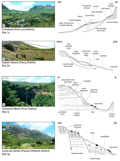 The field survey was performed to verify the presence, geometry, typology, and state of activity of mass movements in specific and most representative sites (Chitrakoot, Quatre Sœurs, Chamarel, and Corps de Garde). The main landslides-prone areas were mapped in the field by collecting data on specific field sheets, including geological–geomorphological field sketches (Figure 8) and photo documentation (Figure 9), showing the relationship between landslides, bedrock lithology, and superficial deposits.