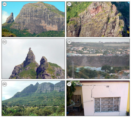 Photo documentation of geomorphological features of Mauritius Island. (a) Corps de Garde, vertical basalt scarps affected by rockfalls; the light color outlines a recent rockfall detachment, at the base of the slope the vegetation covers the rockfall accumulation; (b) Le Morne, detail of a recent rockfall detachment scarp (reddish colored area); (c) Pieter Both, the second-highest peak in Mauritius, one of the symbols of the island, characterized by a poorly stable large block; (d) Grand River North West, landslides affecting the fluvial scarp of one of the main rivers of the island; (e) Chitrakoot, in the background large basalt scarps affected by rockfalls, in the foreground scarps and terraces related to a large complex landslide; (f) Chitrakoot, building damaged due to the landslide activity.