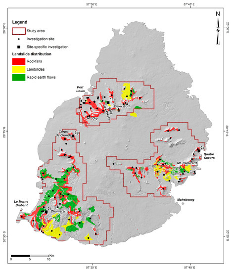 Landslide spatial distribution in the three mountain areas of Mauritius Island, with investigation site locations. This graphical representation includes rockfalls, landslides (complex landslides, translational and rotational slides) and rapid earth flows.