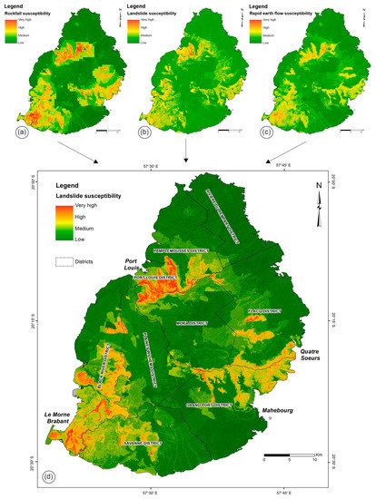 The spatial distribution of landslide susceptibility resulted from the combination of photogeological analysis and field survey. In detail, it was produced by merging data from aerial photo interpretation of high-resolution orthophoto images in the three mountain areas of the island and data from geomorphological field activity in specific-site investigations, defined considering technical reports provided by the Mauritius Ministry of Environment and Sustainable Development. This analysis allowed us to characterize different geomorphological homogeneous areas showing evidence of slope gravity processes such as rockfalls, landslides (complex landslides, translational and rotational slides), and rapid earth flows. This arrangement is summarized and graphically shown in Figure 10.