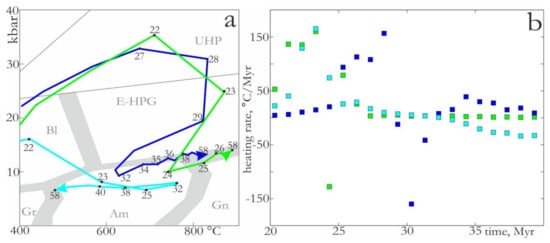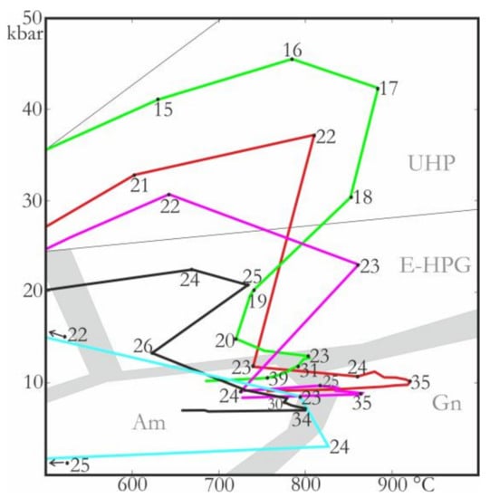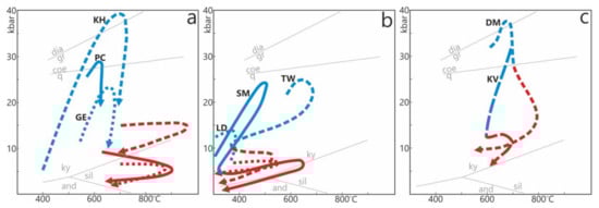 Rocks from the Shuanghe locality in the eastern Dabie UHP belt, an orogenic belt between the Yangtze Craton and the Sino-Korean Craton in China (Figure 1c, DM path) [6,44], and from the Kaghan Valley in the Himalaya (Figure 1c, KV path) [7,45] recorded ultrahigh pressure (UHP) metamorphism followed by heating showing less obvious β-shapes. In the Dabie belt, the rocks already experienced heating during exhumation. The reheating of the eclogites by 100 degrees during exhumation at 12–17 kbar lead to partial melting. The rocks from Kaghan Valley cooled slightly during exhumation and afterwards underwent heating at 10–12 kbar. The eclogites are characterized by fast exhumation rates, and the reheating is explained by slowing of exhumation [7].