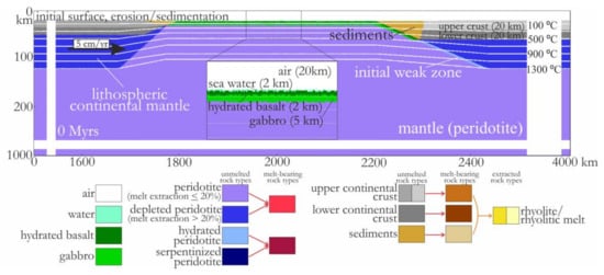 For the melting of the crust, we used a linear function of P–T [91], whereas mantle melting was computed according to the parameterized batch-melting model of Katz et al. [92]. Once the amount of melt for a given marker was more than zero, the lithology changed to the melt-bearing analogue. For these lithologies, we use the term “melt-bearing” to mean a mixture of solids and liquid, whereas for the silicate liquid extracted from melt-bearing rocks, we use “melt”. The melt-bearing mantle from hydrated peridotite has similar properties to the melt-bearing mantle from dry peridotites, but with wet olivine rheology (Table A1 in Appendix A). The melt extraction occurs if the amount of melt is more than 4 vol %. During an extraction episode, we leave 2 vol % melt in the material. Thus, the amount of melt in a melt-bearing material does not exceed 4 vol %. The melt extracted from the melt-bearing lithology was transported instantaneously to the surface as volcanics (20%) and to a site of plutonic emplacement in the crust (80%; at sites of highest possible intrusion emplacement rate [93]). After a melt extraction episode, the yield strength of the lithologies above was decreased according to the melt weakening factor λmelt, which was prescribed as 0.1 and controls the moderate weakening of the lithologies subjected to melt percolation [84,93]. The melts extracted by the melting of continental crust and sediments are here called “rhyolitic”.