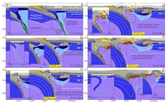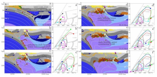 The evolution of experiment R1 is represented in Figure 3, where the continental collision (Figure 3a,b) results in the exhumation of (U)HP metamorphic rocks (Figure 3c–e), accompanied by the continental slab retreat (slab rollback; Figure 3b–e) causing asthenospheric upwelling and partial heating of the exhumed crustal material (Figure 3d,e). In this experiment, we used a relatively short 40 Myrs old oceanic plate, 100-km thick continental lithospheres, and prescribed a long-term pushing of the left-hand continental plate with a constant velocity of 5 cm/yr (Table 1). Due to the prescribed push, the oceanic plate subducted, and the ocean basin closed. Dehydration of the subducted oceanic crust led to hydration/serpentinization of the overlying mantle (light and dark blue colors; Figure 3a). The oceanic–continental subduction was followed by collision, which started at 10 Myrs after the beginning of the experiment, with a continental plate subduction (see white arrows of material movement in Figure 3a). After the continental crust reached a depth of 130 km, the upper crust decoupled, exhumed through the serpentinized mantle, and became stuck at the crust–mantle boundary (Moho) of the overriding plate (Figure 3b). After decoupling of the upper crust, the buoyancy of the continental slab dropped, allowing the oceanic slab pull to prevail, causing further subduction of the lower continental crust (Figure 3b,b’). Later, the oceanic slab started to stagnate in the mantle transition zone; then, it became bent anticlockwise, and flattened at the bottom of the mantle transition zone (Figure 3b’ and Figure S1b,c in Supplementary Materials). It pulled the continental plate behind (down-left), which caused continental slab bending followed by continental slab rollback (Figure 3b–e). The free place was immediately occupied by the hot asthenospheric mantle (white arrows in Figure 3b,c), which penetrated into the wedge, causing heating and partial melting of the subducted lower crustal material from the side (Figure 3b). The melt-bearing lower crustal material that appeared at the contact with the hot mantle started to exhume along this contact, simultaneously with the ongoing mantle upwelling (Figure 3c). As far as the lower crust with the following mantle upwelling reached the overlying subducted upper crust, the upper crust exhumed vertically to the surface (Figure 3c,d). The ongoing slab rollback resulted in spreading of the mantle upwelling to the left and further exhumation of the subducted lower crustal material (Figure 3d,e). Some rocks after the exhumation to the lower crustal depths were transferred through an area with elevated geotherms and intensively heated at this level (conductive heating from the hot asthenospheric mantle). The mantle upwelling brought the geotherm of 900 °C to a depth of approximately 50–60 km (Figure 3e), which stayed approximately at this level until the end of the experiment. The elevated geotherms at the bottom of the crust caused partial melting of the crustal material and the extraction of granitic melts (rhyolites, yellow colors; Figure 3d,e). Around 32 Myrs after the beginning of the experiment, the force balance changed because the whole oceanic slab stagnated in the mantle transition zone (Figure 3f’ and Figure S1c in Supplementary Materials), did not produce enough pull, and the left-hand continental plate started to advance again as long as the push was active (Figure 3f). The compressional force in the orogen led to crustal thickening and exhumation of the upper crustal block, which decoupled at the beginning of collision, diapirically through the overlying crust.