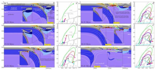 The evolution of the crustal material is recorded by six markers initially located in the left-hand continental crust: two in the upper crust (light blue, and black) and four in the lower crust (red, green, pink, and blue). While the upper crust decoupled from the plate and became stuck at the crust–mantle boundary of the overriding plate (Moho), as in experiment R1, the lower continental crust subducted much deeper (Figure 6a). The ongoing slab rollback resulted in asthenospheric mantle upwelling and exhumation of the crustal material (Figure 6b,c). The green marker initially located close to the continental margin reached a depth of 150 km and exhumed backward along the contact with the mantle upwelling (Figure 6a,a’,b,b’). The later arrived markers from the lower crust reached slightly shallower depths of 90–120 km (Figure 6e’). All markers were exhumed to the bottom of the overlying plate (the Moho). Depending on an exhumation path, some markers showed slight cooling during exhumation (green, red, and pink markers; Figure 6c,c’,d,d’); the others, similar to the blue marker in Figure 6e’, exhumed directly along the contact with the hot mantle and showed almost isothermal decompression. Most of the markers experience rapid 100–200 degrees of heating during 1–8 Myrs (Figure 7). The black marker from the upper continental crust showed a similar P–T–t path of a β-shape with the late heating of almost 200 degrees within 8 Myrs (Figure 6 and Figure 7). A distinct exhumation path has the light blue marker from the upper crust. After the exhumation to the Moho, it was incorporated into the rhyolitic melts, extracted from the melt-bearing continental crust below, and brought to the near surface area (Figure 6c,c’,d,d’). The extreme heating of this marker by 400 degrees within 1 Myrs (Figure 6d’ and Figure 7) is connected with its juxtaposition to the melts.