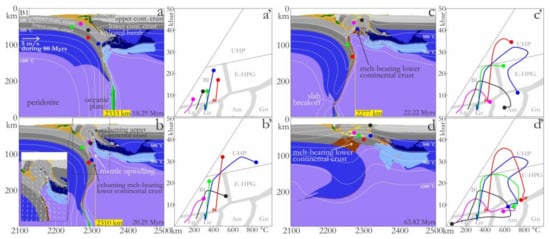 Four time-slice snapshots showing the evolution of experiment B3 with a shallow slab breakoff (left column) and the associated representative P–T–t paths of crustal material (right column). Colored circles on the snapshots are markers that refer to the diagrams with the P–T–t paths (a’–d’). The model involves (a) subduction of an oceanic plate, followed by subduction of the continental plate, (b) slab breakoff, followed by (c) the exhumation of (ultra)high pressure ((U)HP) metamorphic rocks, and (d) final relaxation stage.
