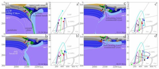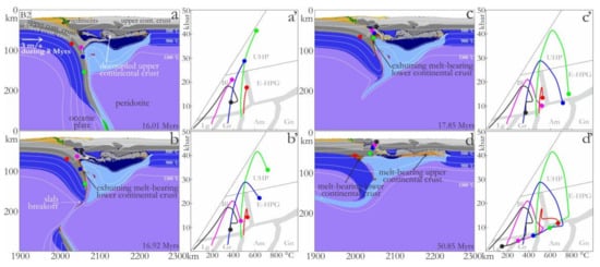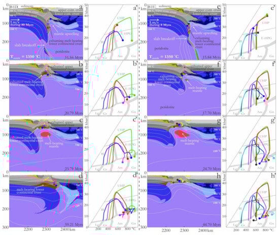 Thus, none of these scenarios led to any breakoff-related asthenospheric mantle upwelling, which could cause later heating of the exhumed metamorphic rocks. To check the influence of the ambient mantle temperature, we performed two additional experiments with a slightly higher mantle temperature (1350 °C instead of 1300 °C): experiment B1D, similar to experiment B1, and experiment B1E, similar to experiment B1D, but with a shortly applied pushing (Figure 11). A slab breakoff in these experiments occurred earlier and at shallower depths (170–200 km) than in experiment B1 (Figure 11a,e). After slab breakoff in experiment B1D, which occurred at 16.84 Myrs after the beginning of the experiment (Figure 11a), the collisional zone experienced a relaxation stage during 4 Myrs with gentle cooling (Figure 11b). Due to the redistribution of the exhumed crustal material at the Moho, some markers were characterized by a slight heating up to 100 degrees at 15–20 kbar (e.g., blue and green markers, Figure 11b’). After that, another pulse of mantle upwelling occurred at the same location, which was accompanied by mantle decompression melting (Figure 11c), and spread toward the subducted plate, pushing it slightly to the left, i.e., causing slab rollback (Figure 11c). The second pulse of mantle upwelling in this experiment was related to the deep mantle flows due to the stagnation of the oceanic slab at the model lower boundary, and thus should not be considered as a consequence of the slab breakoff. In contrast with experiments B1 and B1D where the exhumation of the upper crust followed by the mantle upwelling started before slab breakoff (Figure 8b and Figure 11a), in experiment B1E they occurred simultaneously (Figure 11e). The evolution of experiment B1E is similar to that of B3 (with shallow slab breakoff). In both experiments, the early occurring slab breakoff prevented spreading of the mantle upwelling along the subducted lower crust. Instead, the decoupling and exhuming crustal material created the space for the mantle upwelling below (Figure 10c and Figure 11f). In experiment B1E, that resulted in partial melting of the mantle and continental slab rollback (Figure 11f–h). The effect of the hot mantle appearing below the exhumed crust is similar to the previous experiments. The exhumed material experienced later heating at 5–15 kbar up to 100 degrees (Figure 11g,g’), and in the extreme case, when the crustal material appeared to be surrounded by the hot mantle due to the material redistribution at the Moho, the heating reached 300 degrees, e.g., the light blue marker in Figure 11g’. The exhumation rates of the crustal material reached 8 cm/yr in this experiment. Thus, whereas in R1 and R2 slab rollback led to mantle upwelling, in this experiment, the opposite was observed: a slight slab rollback was caused by the spreading of a partial melting zone of the mantle upwelling caused by the decoupling and exhumation of the subducted crust.