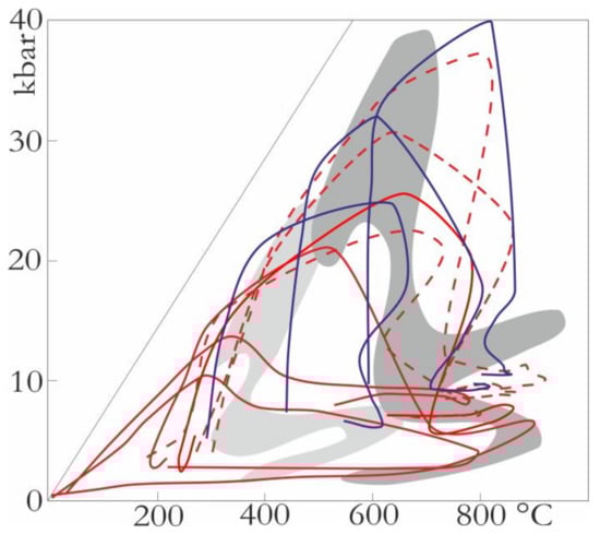 A similar P–T–t path shape but at lower pressure for the first metamorphic stage was proposed for the Lepontine Dome in the Central Alps (Figure 1b, LD path). Subduction-related metamorphism under blueschist facies conditions occurred 40–30 Myrs ago and was followed by a decompression stage that lasted until 30–25 Myrs ago. Shortly after (20 Myrs ago), the rocks underwent Barrovian-type thermal overprint, reaching temperatures of around 550 °C at 7 kbar [37]. The authors argued that the increase in temperature occurred under static conditions and could be explained by the radiogenic heat production of additionally accreted continental blocks. However, this idea is not consistent with other modeling [38], which showed that additional tectonically accreted radiogenic material alone cannot reproduce such a rapid temperature increase as recorded by the Lepontine gneisses. Instead, a hot asthenosphere upwelling due to a shallow slab detachment is a more probable source for the re-heating. The same mechanism was proposed for the Internal Penninic Nappes in the Western Alps, which also show some post-collision re-heating [39,40,41]. The rocks south from the Lepontine Dome, in the Southern Steep Belt, also show evidence of β-shape P–T–t paths but at higher metamorphic grades reaching pressures over 20 kbar by the first stage and temperatures over 700 °C at shallow depths by the second stage of late heating [42,43].