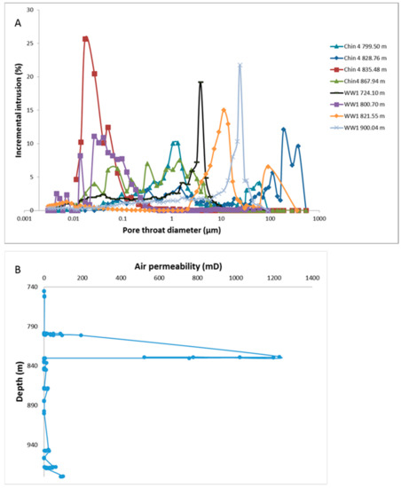 (A) Pore throat distributions of Hutton Sandstone cores from the Chinchilla 4 (Chin 4) and West Wandoan 1 (WW1) wells by depth (m). (B) Core air permeability measured in the Chinchilla 4 well core Hutton Sandstone.