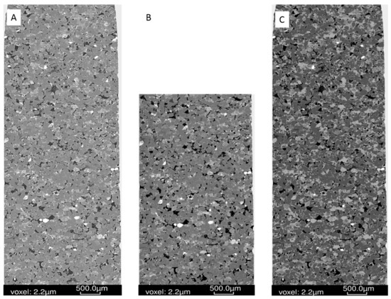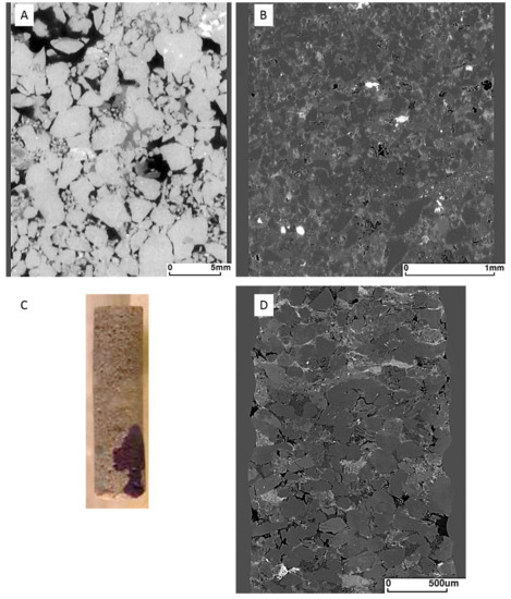 The Hutton Sandstone cores from the two wells show a variety of pore throat distributions (Figure 1A). The Chin 4828.76 m core with large pore throats corresponds to the coarsest grained sandstone with visible open pores (Figure 2A), and Chin 4835.48 m with a relatively high clay content has the majority in the range 0.01–0.1 µm (Figure 1A, Figure 2B, Figure 3). The Chin 4828.76 m sandstone corresponds to a region with high measured air permeabilities up to 1228 mD (Figure 1B). Table 1 compares the corresponding MICP porosities with those by µCT or helium (He) porosities (along with Table 2). The He porosities tend to give the highest estimates likely owing to the small size of the He molecule, with MICP and µCT values generally in reasonable agreement with each other. Selected µCT tomograms and SEM images of the Chinchilla 4 well cores are shown in Figure 2 and Figure 3. The 799.5 m core for example is calcite cemented, the 835.48 m core contains 10% chlorite which along with kaolinite fills and rims pores. QEMSCAN images and quantified mineral components by QEMSCAN or XRD are given in Supplementary Materials Figure S2, Tables S1 and S2, along with the volume % of X-ray distinct components Table S3. The WW1 cores are equally variable in lithology, including chlorite rich and calcite cemented sandstones, two also contain coal (Figure 4, and Supplementary Materials Figure S3).