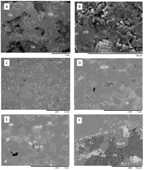 SEM BSE images of Hutton Sandstone from the Chinchilla 4 well (A) calcite cemented sandstone from 799.5 m; (B) chlorite and Fe-oxide in 867.94 m; (C–F) 835.48 m, chlorite and kaolinite have rimmed and filled porosity. Qz = quartz, Cl = calcite, Chl = chlorite, FeO = Fe-oxide, Ca-Pl = Ca-plagioclase, Na-Pl = Na-plagioclase/albite, Ka = kaolinite.