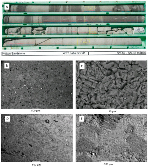Drill cores were sampled from the Hutton Sandstone of the GSQ Chinchilla 4 well (latitude –26.72722, and longitude of 150.2014 decimal degrees, approximately 10 km SSE of Miles), and the West Wandoan 1 (WW1) well (latitude –26.181622, longitude 149.812422, approximately 19 km south west of the town of Wandoan), in Queensland, Australia. The stratigraphic column and a map showing the well locations in given in Supplementary Materials Figure S1. The West Wandoan 1 well was drilled for a CO2 storage feasibility study of a demo scale injection into the Precipice Sandstone. Core air permeability, mercury intrusion porosimetry (MICP), and Helium porosity of the Chinchilla 4 well cores described here were performed at Weatherford. MICP, He pychnometry, permeability, and X-ray diffraction of West Wandoan 1 core was performed at the University of Queensland (UQ) by methods reported previously [10,23,24]. Scanning electron microscopy (SEM) and Energy Dispersive Spectroscopy (EDS) in back scatter detection mode (BSE) with both a low-vacuum JEOL 6460LA environmental SEM (Peabody, MA, USA), and Hitachi TM3030 (Tokyo, Japan) with a Bruker EDS (Billerica, MA, USA) was performed on polished thin sections and blocks. Core total acid digestions or lithium metaborate fusions and loss on ignition were performed in the UQ Environmental Geochemistry Laboratory.