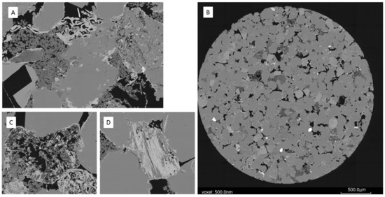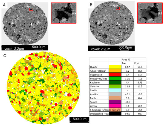 Micro CT was performed on sub-plugs to visualise and calculate pore space. QEMSCAN is an automated mineral quantification based on SEM-EDS that also provides visualisation of mineral associations and grain sizes. These were performed on polished sub-plug sections by FEI Australia (Canberra, Australia) (and more recently at the Australian National University) as described in detail previously [11,25,26]. Briefly, for the WW1 724.1 m sample that was reacted, a 3 mm diameter sub-plug was digitally characterised in 3D by X-ray micro computed tomography (μCT) with a voxel size of 2.2 µm. The 3D μCT images were registered into perfect geometric alignment with higher-resolution 2D SEM images and automated quantified SEM-EDS (QEMSCAN®) mineral maps were produced of a polished sub-plug slice from a trimmed end. The sub-plug was reacted, before being imaged again after reaction, and the two sets of before and after reaction images registered to one another to characterise the changes.