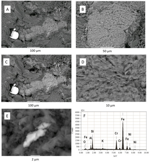 Whole rock digest data for total metal content in the core is given in Supplementary Materials Table S5. Concentrations of U and As in the 724.1 m and other cores from WW1 were generally below 3 mg/kg. Concentrations of Pb were 9–11 mg/kg, Cr 6–40 mg/kg (with the highest in 724.1 m), and Ni 3–15 mg/kg (with again the highest concentration in 724.1 m). Rb and Li were 38–64 mg/kg (with the lowest in 724.1 m), and 9–21 mg/kg (with the highest in 724.1 m), respectively.