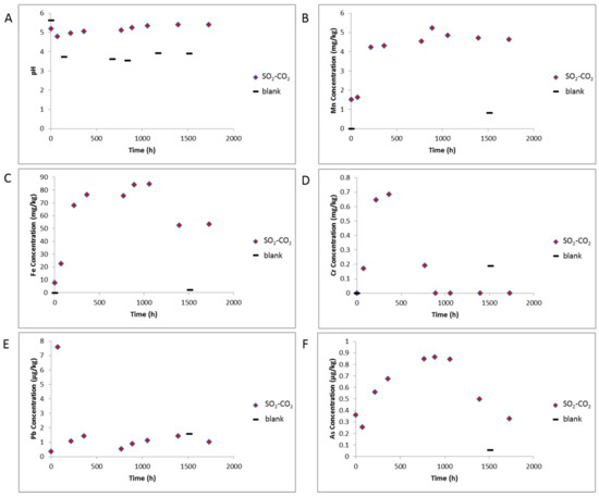 The measured ex situ pH decreased from 7.5 to 5.2 after the rock—water soak period, and then to 4.8 after CO2-SO2 addition to reactors. The pH then increased slightly to 5.41 by the end of the reaction (Figure 9). The measured electrical conductivity decreased slightly from 2.79 to 2.48 ms/cm and increased to 3.57 ms/cm by the end of the experiment (Supplementary Materials Figure S7). The pH varied from 3.54 to 3.93 during the blank experiment without rock, and conductivity from 2.09 to 2.59 ms/cm indicating some pH buffering by minerals in the experiment containing the rock core. After CO2 -SO2 injection, several dissolved elements increased including Ca, Mn, Mg, Fe, Cr, As, Pb, Rb, Ti, Tl, Al, Zn, K, Si, S (Figure 9, Figure 10, Supplementary Materials Figures S7 and S8). Fe-Mg-(Mn)chlorite corrosion was observed directly in SEM images, and contributed to dissolved Fe, Mg, Mn, Si, and Al. Ni, Zn, Ti and Li can also substitute into the chlorite structure and may have been partly sourced from chlorite dissolution. Dissolution of trace amounts of calcite or ankerite/siderite would contribute to the Ca, Mg, Mn, and Fe. Tl has been shown elsewhere to substitute into and be sourced from carbonate mineral dissolution in CO2-water-rock reactions of calcite or dolomite [3]. The gradual increases in K and Rb indicate minor corrosion of feldspars or illite continuing over the reaction timescale. Several elements including Fe, As, Zn, Al, Ca, had a decreasing trend after ~1000 h, with dissolved concentrations of Cr, Pb, Al, Ba, decreasing significantly before ~500 h. These were likely either adsorbed or precipitated onto rock surfaces e.g., in the precipitated oxide minerals observed or as surface coatings. Barite precipitation was not directly observed however its low solubility, the decreasing dissolved Ba, and the presence of dissolved S indicates its likely precipitation. Barite precipitation has been directly observed in other CO2-SO2-water rock reactions of calcite cemented sandstone where higher concentrations of SO2 (0.16%) were used [25,37]. The rock surfaces had a brown coloration after reaction supporting precipitation of Fe-containing minerals as surface coatings that may not have been visible in SEM images (Supplementary Materials Figure S9). Dissolved Ni was variable and appeared to increase at the end of reaction with the blank experiment indicating some potential contribution from the reactor. Dissolved Cr concentration at the end of the blank experiment was higher than the experiment with the rock present also indicating some contribution from the reactor. The reason for the lower Cr concentration at the end of the experiment with rock present may be owing to the higher pH (therefore less reactor corrosion), or likely the precipitation of Cr containing minerals seen on the rock surface. The dissolved concentrations of Pb, U and As were relatively low at less than 8, 1 and 1 µg/kg, respectively, during the reaction.