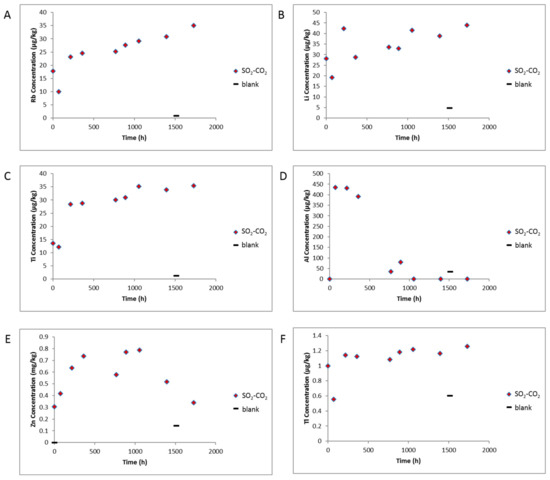 Water chemistry during reaction of West Wandoan 1 Hutton Sandstone 724.1 m, and the blank reaction without rock. The point at time 0 h is after the N2-low salinity water-rock soak (A) Concentration of Rb; (B) Concentration of Li; (C) Concentration of Ti; (D) Concentration of Al; (E) Concentration of Zn; (F) Concentration of Tl. Note E is shown in mg/kg.