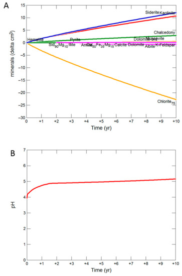 The kinetic geochemical model prediction of reaction of Hutton Sandstone with a mineral composition of the 724.1 m core is shown over 10 years in Figure 11. The alteration of chlorite to siderite, kaolinite and chalcedony is mainly predicted. Dissolution of albite, K-feldspar, siderite, ankerite, calcite and precipitation of pyrite and ankerite is also predicted. Pyrite was predicted to precipitate in Hutton Sandstone WW1 724.1 m, sourcing S from the co-injected SO2. In the current reaction of Hutton Sandstone WW1 724.1 m the predicted altering mineral volumes are relatively small, with only 25 cm3 of (original 1279 cm3 Supplementary Materials Table S4) chlorite dissolved, and 13 cm3 of siderite precipitated with 12 cm3 of kaolinite, and with no net change in volume (or porosity). A pH of 5.2 was predicted after 10 years, with the concentration of dissolved Fe only 4.18 mg/kg as Fe was mainly sequestered with CO2 as siderite. Net mineral trapping was predicted as 1.55 kg/m3 CO2 as siderite after 10 y (based on the method of Watson and Gibson-Poole ) [38]. Additional modelling scenarios for Hutton Sandstone WW1 724.1 m allowing precipitation of smectite are shown in (Supplementary Materials Figure S10), where precipitation of smectite occurs mainly replacing kaolinite precipitation.