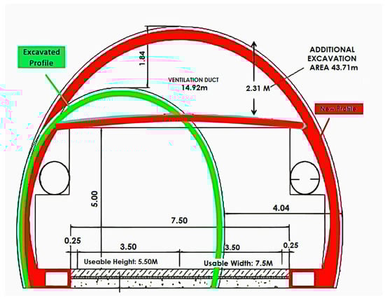 Different studies have investigated the widening of tunnels under safety consideration simultaneous with traffic operations in a tunnel [,]. The concept of “traffic protecting steel shell” was introduced inside the existing profile of an original tunnel for traffic protection [].