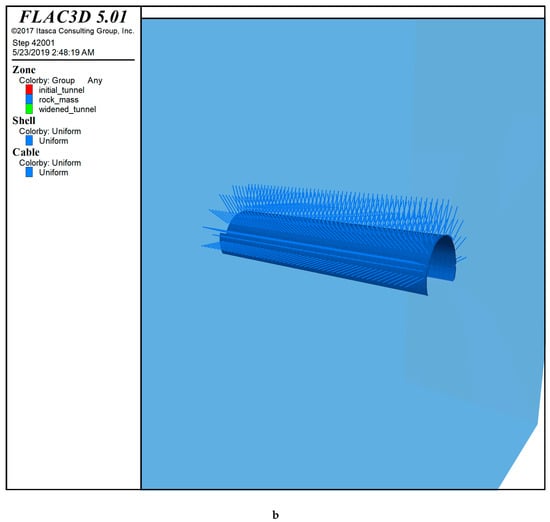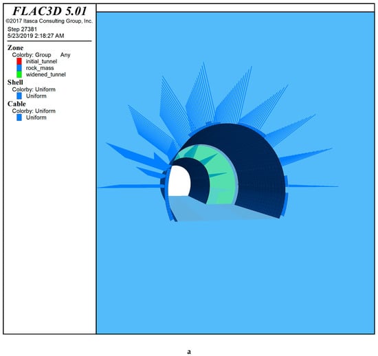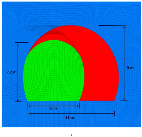The models for different tunnel shapes, as stated in Table 4, were developed with the boundary extended up to six times the diameter of the tunnel in each direction in plane symmetry, whereas the model was extended up to 30 m length in the longitudinal direction. The vertical and horizontal constraints were applied to the model boundary, while the horizontal, vertical, and longitudinal stresses were applied to the model with the values stated in Table 2. The monitoring point was adopted at the crown of the widened tunnel at the midway of the longitudinal direction, i.e., 15 m from the face of the tunnel and the overburden depth over the tunnel model was considered as 1250 m, similar to that of the Lowari tunnel with the stresses stated in Table 2. The pictorial view of the models is shown in Figure 7, whereas the tunnel support characteristics are defined in Table 5.
