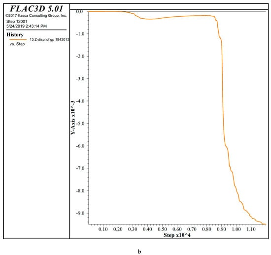 Each excavation drive was considered for a 3 m length with full face excavation; thus, excavation of the initial and widened tunnels was simulated separately for 10 advancement drives. A time step of 500 was taken for each excavation drive; thus, a total of 5000 steps were taken for the initial small tunnel excavation, and the same steps were considered for the excavation of the widened tunnel with a cumulative 10,000 time steps.