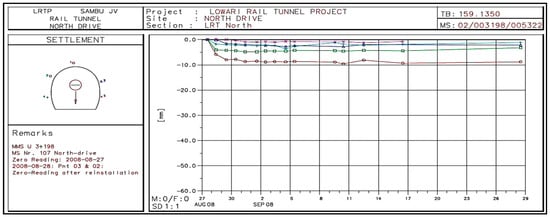 Actual monitoring of the tunnel at chainage 5 + 322. The deformations at crown are shown with red circular dots. The end deformation of 8.25 mm was recorded at the project site.