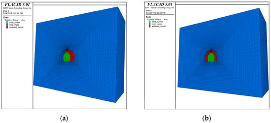 The horseshoe tunnel was modelled first for the simulation of both asymmetric and symmetric tunnel deformation. The Lowari tunnel profile was first developed separately for asymmetric and symmetric widening in AutoCAD as a DXF file. Afterwards, the profile in the DXF file was imported into FLAC3D [] and the model was simulated with all parameters assigned as per the parameters and in situ stresses encountered at the project site, as stipulated in Table 1 and Table 2. Both models were analyzed with continuum modelling wherein the discontinuities recorded from the site conditions encountered at the Lowari tunnel were modelled as elements [,].