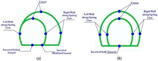 Monitoring points at the tunnel periphery for (a) the asymmetric widened tunnel; (b) the symmetric widened tunnel.