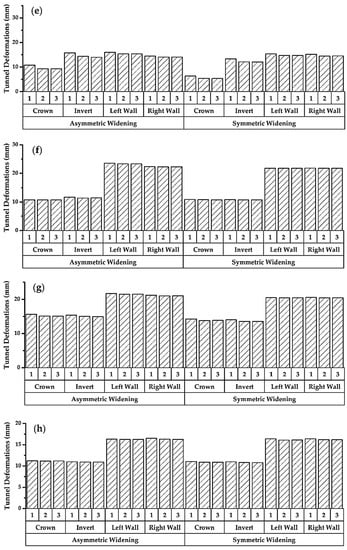 In cases f to h in Figure 8f–h, the tunnel deformation in both widening areas was similar with an insignificant difference. Therefore, it can be assumed that the tunnels with regular, box, rectangular, and semi-elliptical shapes have insignificant differences between asymmetric or symmetric widening.